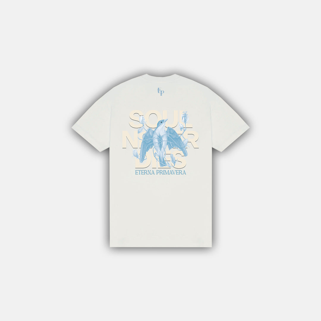Camiseta color blanco crema , con un nuevo molde semi-oversize, hecha en 100% algodón premium de 250 gsm. La camiseta tiene cuello redondo en rib, estampado con el diseño Renacer en la espalda y un estampado de la marca en la parte delantera